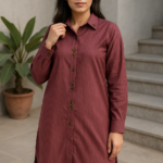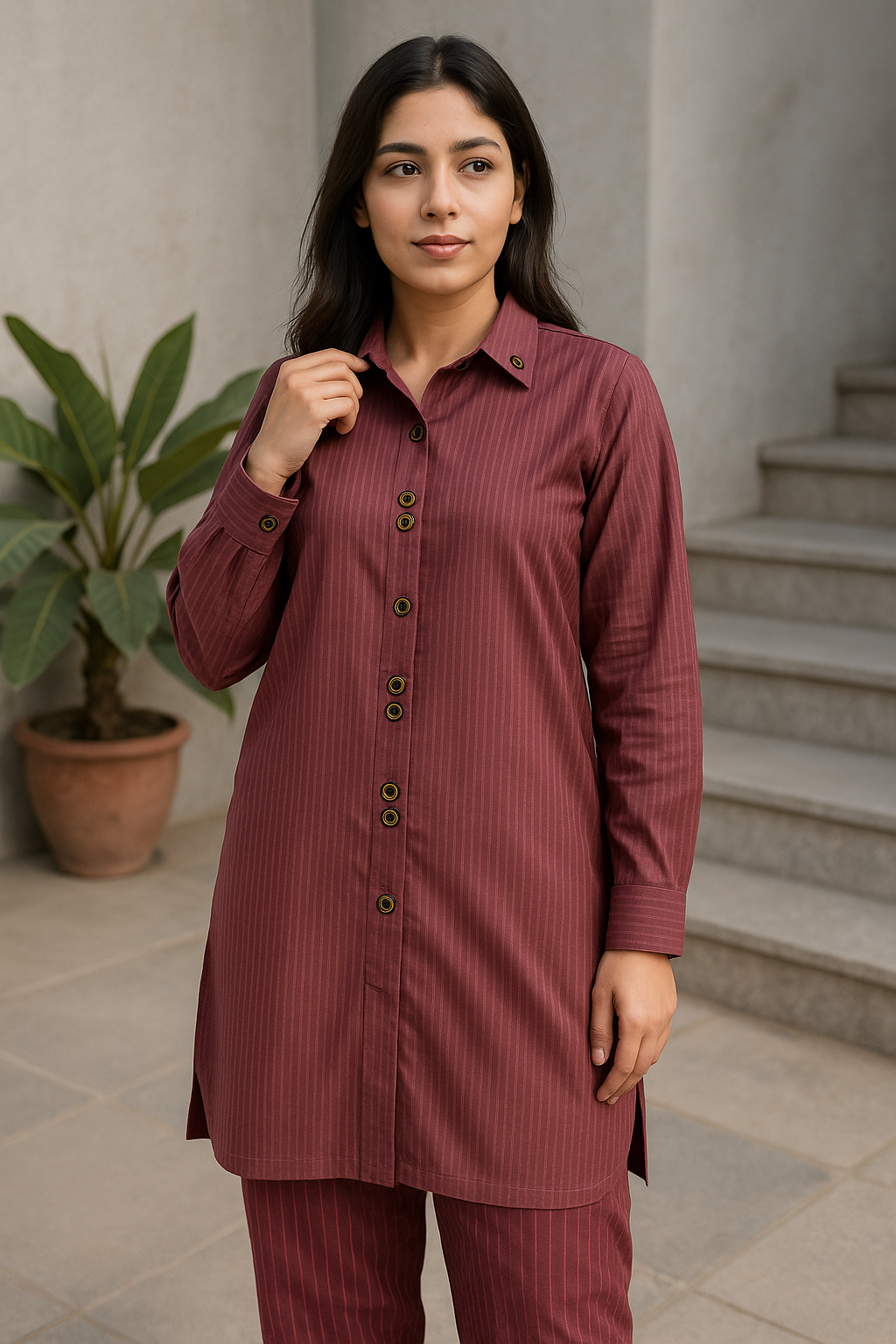 Maison Blush is a statement of effortless sophistication. Crafted in a soothing tea-pink shade, this winter co-ord set combines clean tailoring with subtle metallic accents, making it perfect for both casual days and semi-formal winter gatherings.